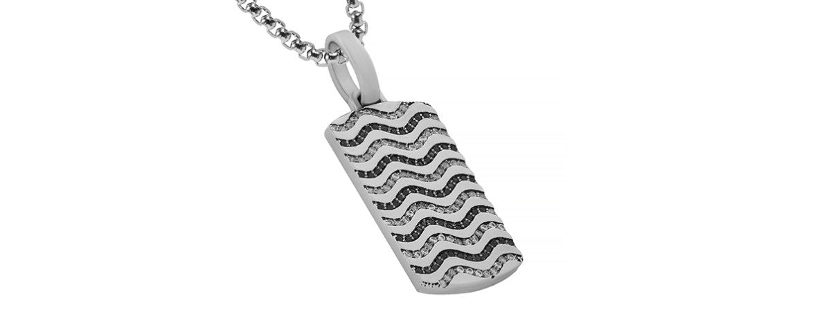 Mens Striped Silver Tag Pendant with Black Gemstones
