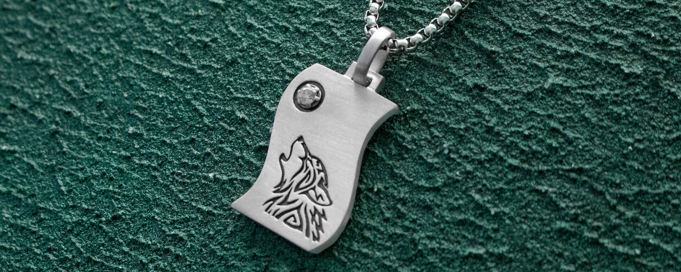 Silver Dog Tag with Engraved Wolf and Moon Gemstone
